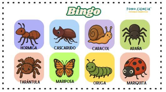 CONTIENE 2 TABLEROS DE BINGO, FICHAS MEMO, PLANTILLA Y BICHOS EN BLANCO Y NEGRO PARA JUGAR A PEGARLOS Y COLOREAR