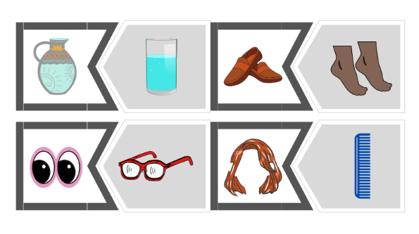 El juego de Asociaciones semánticas cuenta con 24 asociaciones semánticas, cuyos pares de piezas se encastran como las de un rompecabezas simple.